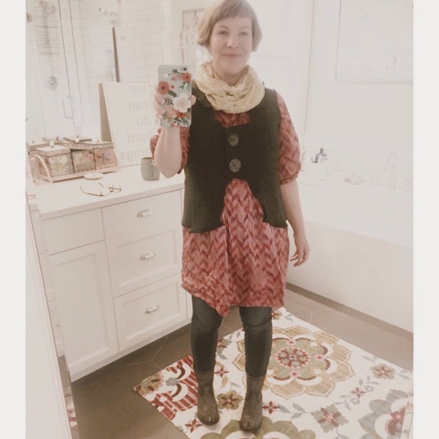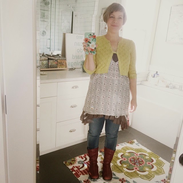 On the list today: meeting with accountants, lunch with new friends, art date with an old friend, and admin work squeezed in the nook and crannies of the day. Got dressed up in joy for the fullness. Slip dress under a tunic I bought from my favorite local boutique years ago (@tumbleweedboutique) under a cropped cardigan. Throw on some skinny jeans and red boots and call it done.