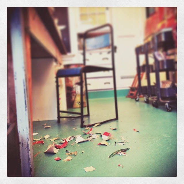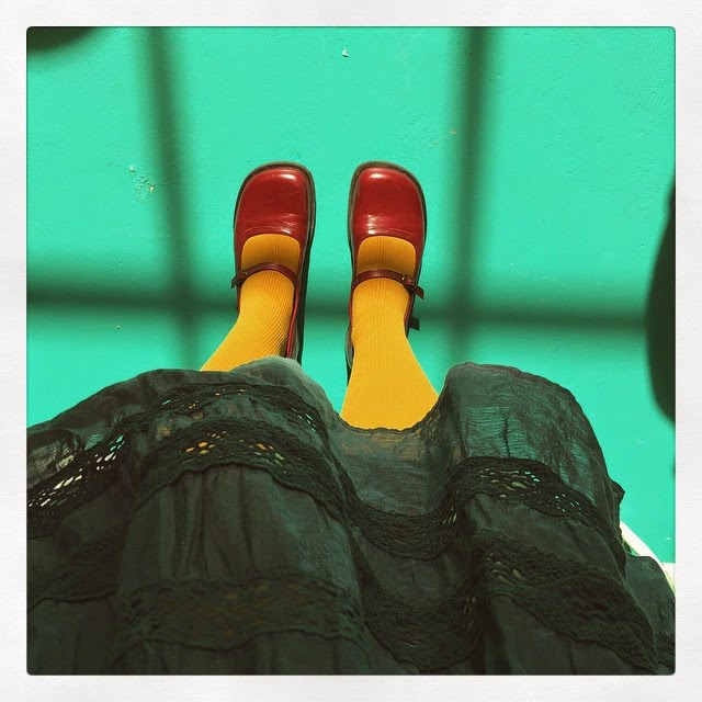 The light on the studio floor looks like a window. Also, wearing my red ruby wedding shoes today. And tights. It's been forever since I wore them and I adore this mustard color. Also, it's sunny and 67 in portland today.