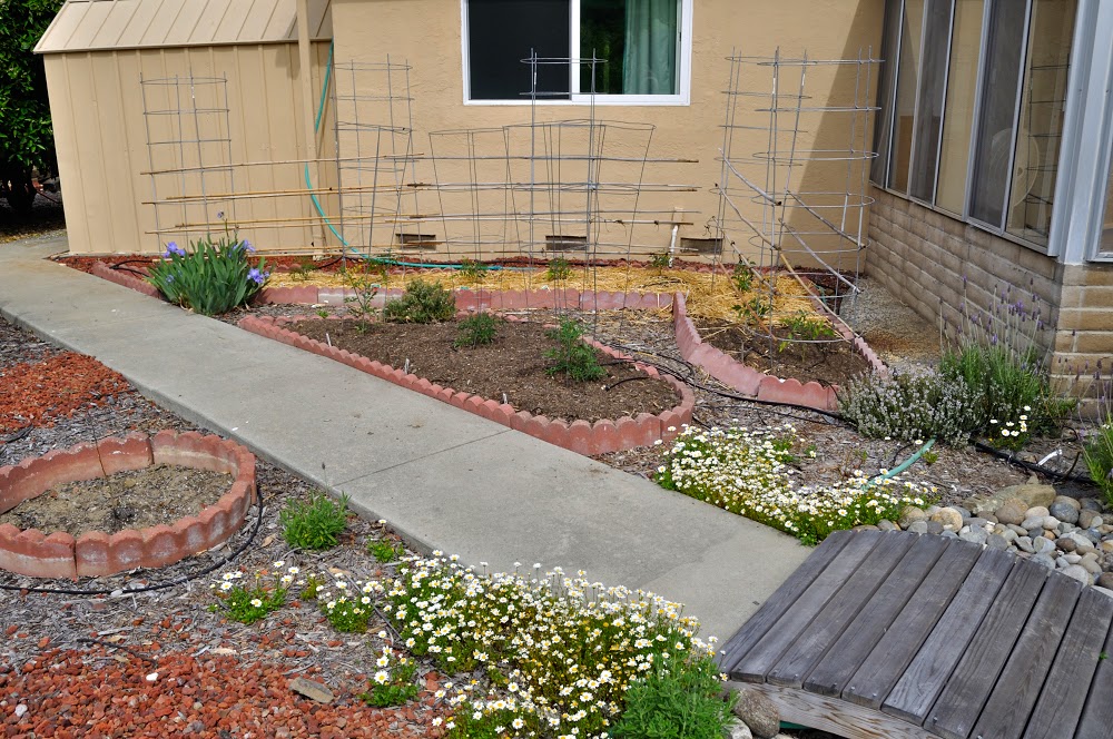 The tomatoes are in (I hear a collective wince from the Santa Clara Master Gardeners!) but its a kind of experiment, and I want tomatoes sooner rather than later this year.