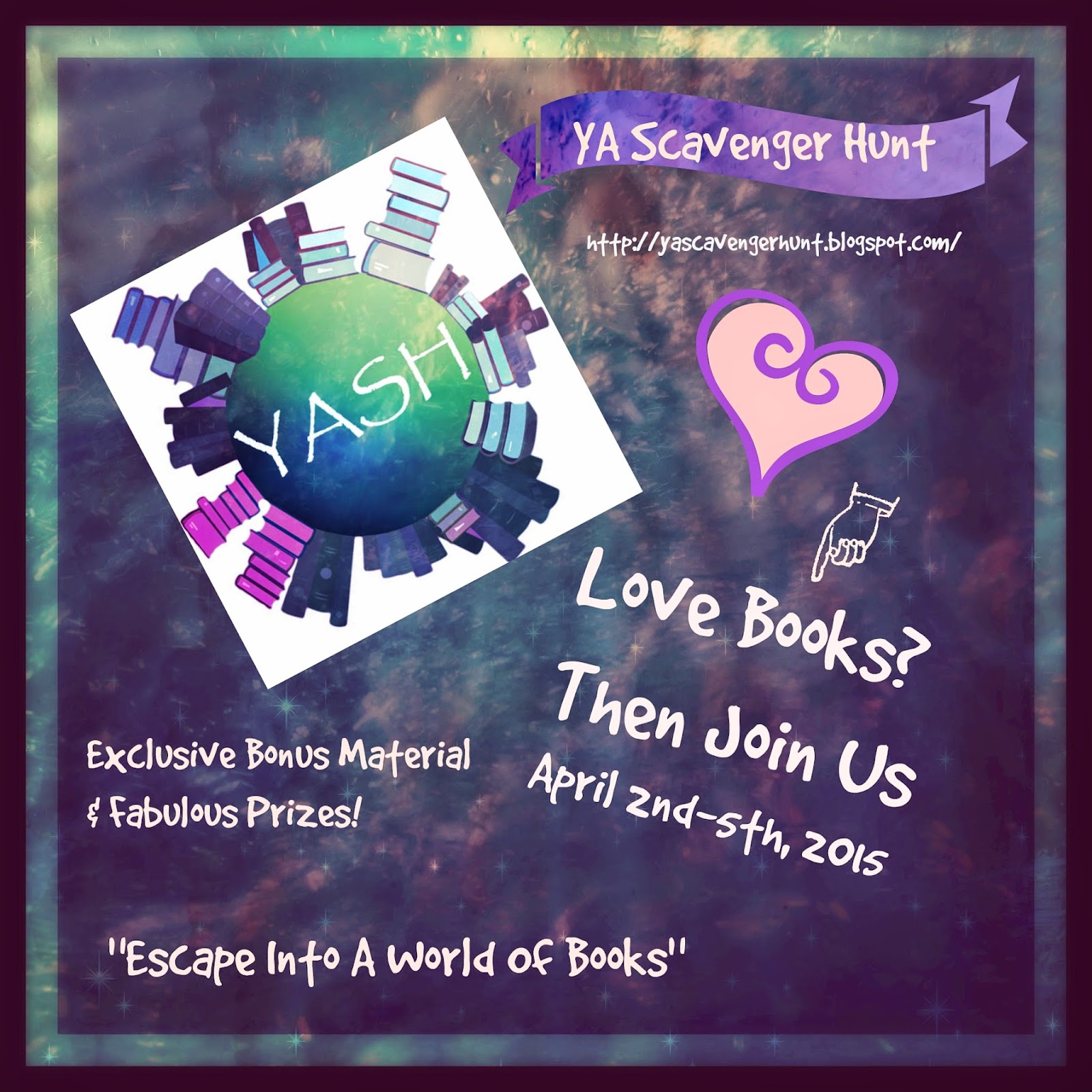 The Scavenger Hunt runs from April 2nd through April 5th beginning and ending at noon Pacific time on those days.  If you've never been a part of the hunt before you should give it a try. It runs like a giant blog hop, introducing you to new YA authors and books along the way.