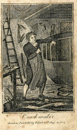 Though from a much earlier date, Samuel Pepys records a visit to his coachmaker in his Diary: "I to my coachmaker's, and there vexed to see nothing yet done to my coach, at three in the afternoon; but I set it in doing, and stood by till eight at night, and saw the painter varnish it, which is pretty to see how every doing it over do make it more and more yellow: and it dries as fast in the sun as it can be laid on almost; and most coaches are, now-a-days, done so, and it is very pretty when laid on well, and not too pale, as some are, even to show the silver. Here I did make the workmen drink, and saw my coach cleaned and oiled; and staying among poor people there in the alley, did hear them call their fat child Punch, which pleased me mightily, that word being become a word of common use for all that is thick and short. At night home, and there find my wife hath been making herself clean against tomorrow; and late as it was, I did send my coachman and horses to fetch home the coach to-night, and so we to supper, myself most weary with walking and standing so much, to see all things fine against to-morrow, and so to bed."