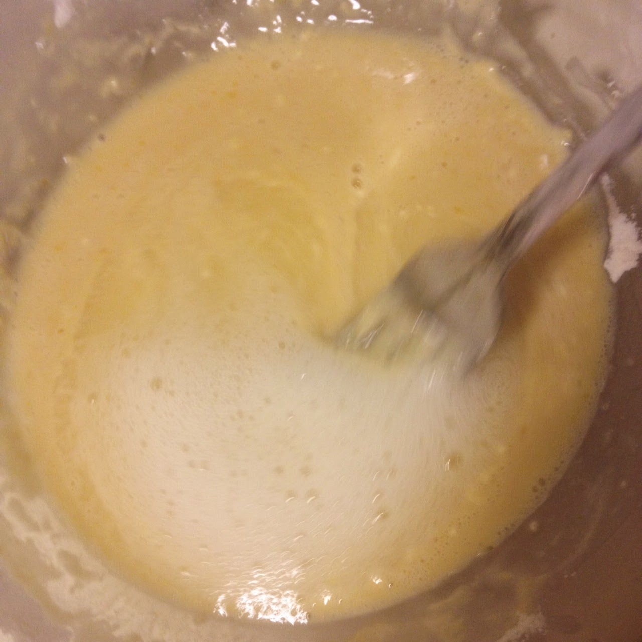 Breaking slightly from the directions, I tossed the rest of the brown sugar in a bowl with one egg yolk (the egg white went in another bowl and was whipped for later use), milk, and maple flavoring (which, to be honest, I just used some syrup, because I figured it was maple flavored).