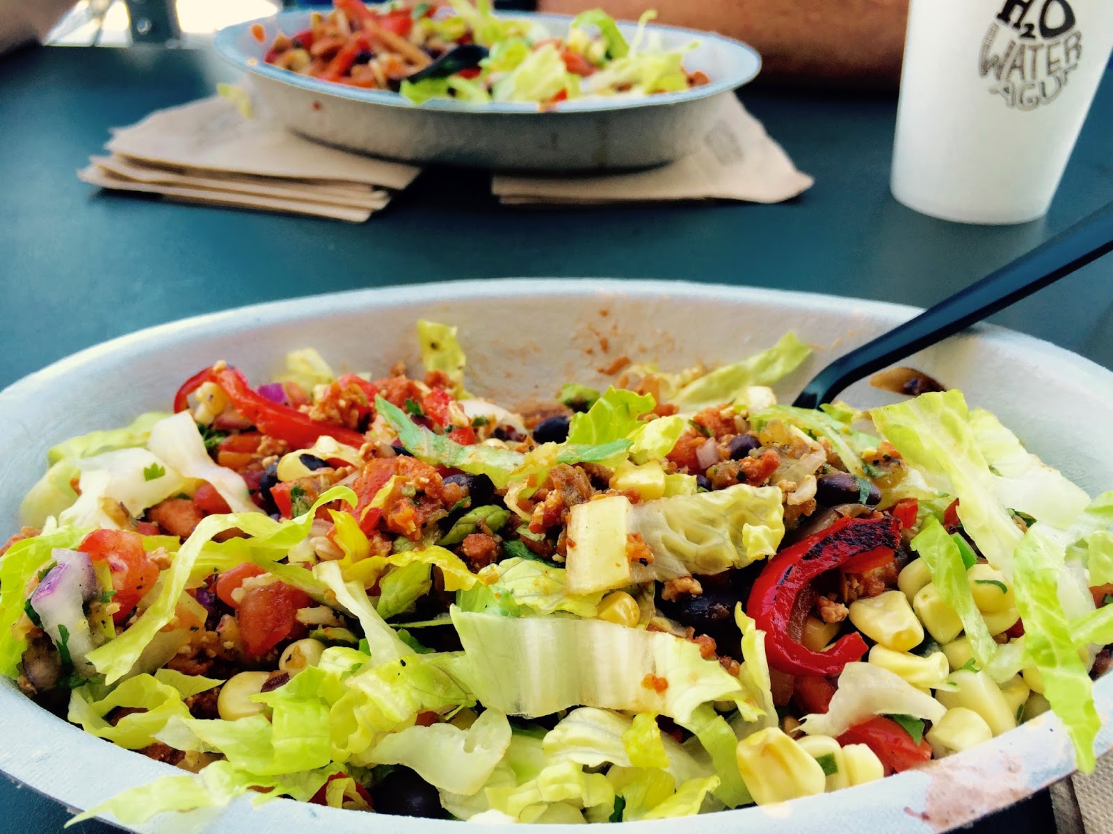 Sofritas—cooked organic, crumpled and seasoned tofuCilantro-Lime Brown Rice (half of normal serving)Black BeansFajita Veggies (lots of them)Topped with—Mild Fresh Tomato SalsaMedium Hot Tomatillo Green Chili SalsaMedium Hot Roasted Chili-Corn SalsaLettuce