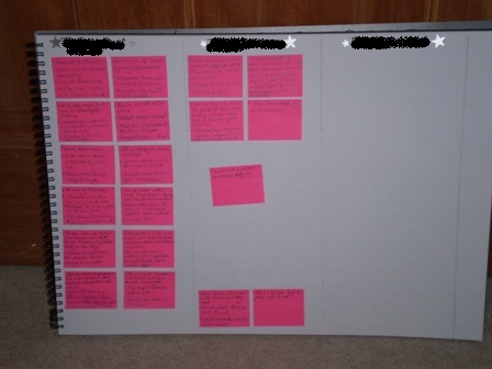 The second thing I did was to divide one page into three parts and start putting Post-its in lines so that I could see the stories for each book working parallel to one another. You will notice, by the way, in these pictures, that I have deliberately blurred out a lot of the words and the titles. This is because I know that certain readers, naming no names (*cough*Saya*cough*) would have no hesitation in zooming in and trying to make out details of The Big Secret Project. And since it's Secret, and all subject to change anyway, I just can't have that. Sorry! But I hope you can still see what I was aiming for.