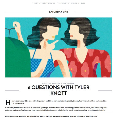 In case you missed it, I was recently given the honor of providing 8 brand new poems for the latest issue of the amazing Darling Magazine.  The poems were for each of the different “Personas” that break up their beautiful magazine,  The Dreamer, The Hostess, The Confidant, The Stylist, The Explorer, The Beautician, and the Achiever, and I was honored to do so.  Recently, they did a follow-up interview with me, it’s now up on their blog.  Head over and check it out, give them a follow @darling and tell them @TylerKnott sent ya.