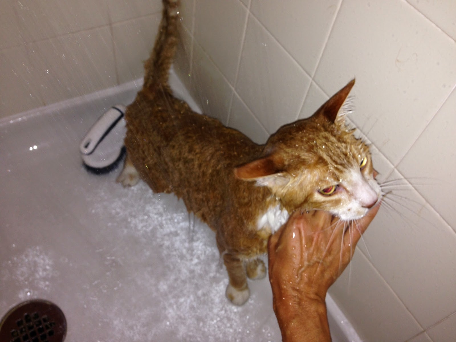 6. Lovingly pick up kitty and love on him/her - feet facing out - and back into the shower.
