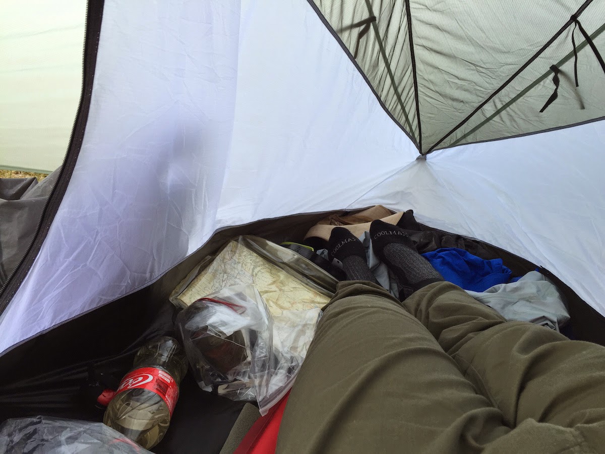 Camp one. Actually more sheltered than it looks, but still a windy spotfor the night.This was my first time using the Tarptent Notch in anger, and I have to say it coped very well with the galeforce winds overnight. (See my first impressions of this tent here.) The tapered ends cut into oncoming winds magnificently and the pole apex guylines held the structure rigid. Ventilation was excellent and there was no condensation to speak of. Thanks to my earplugs, I had a very good night's sleep – but woke to heavy rain and even heavier gusts the next morning.
