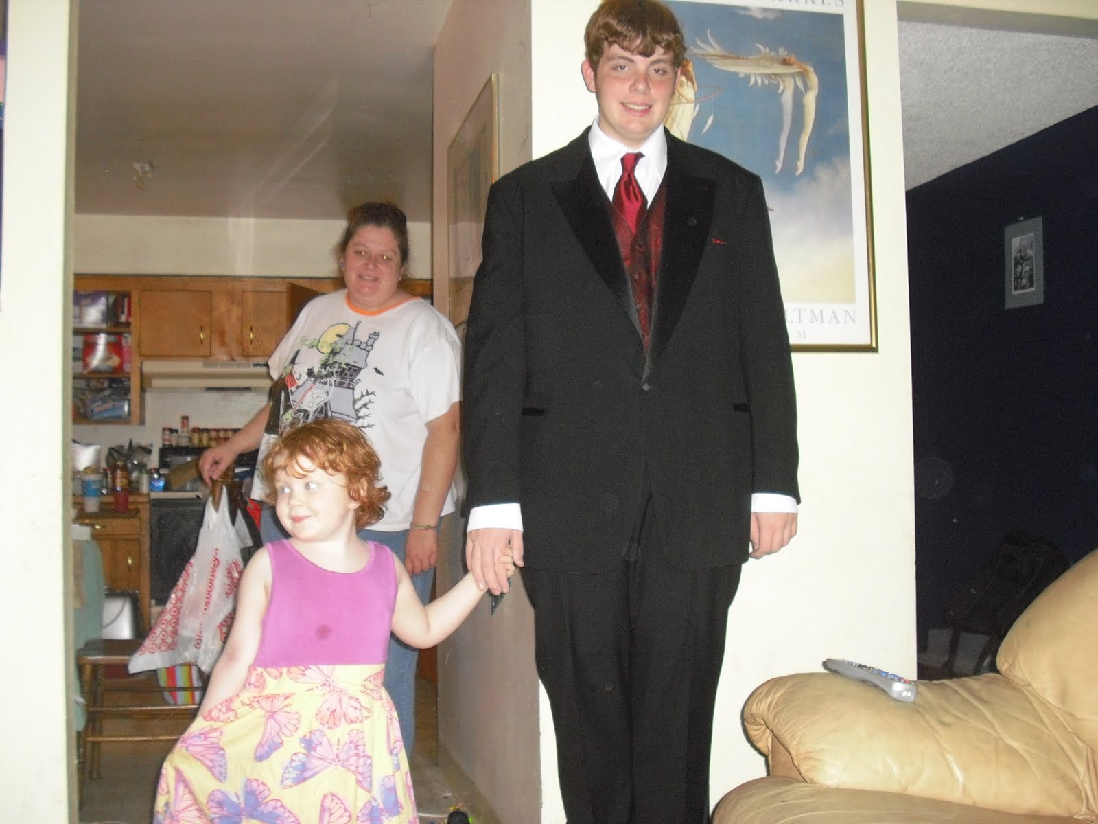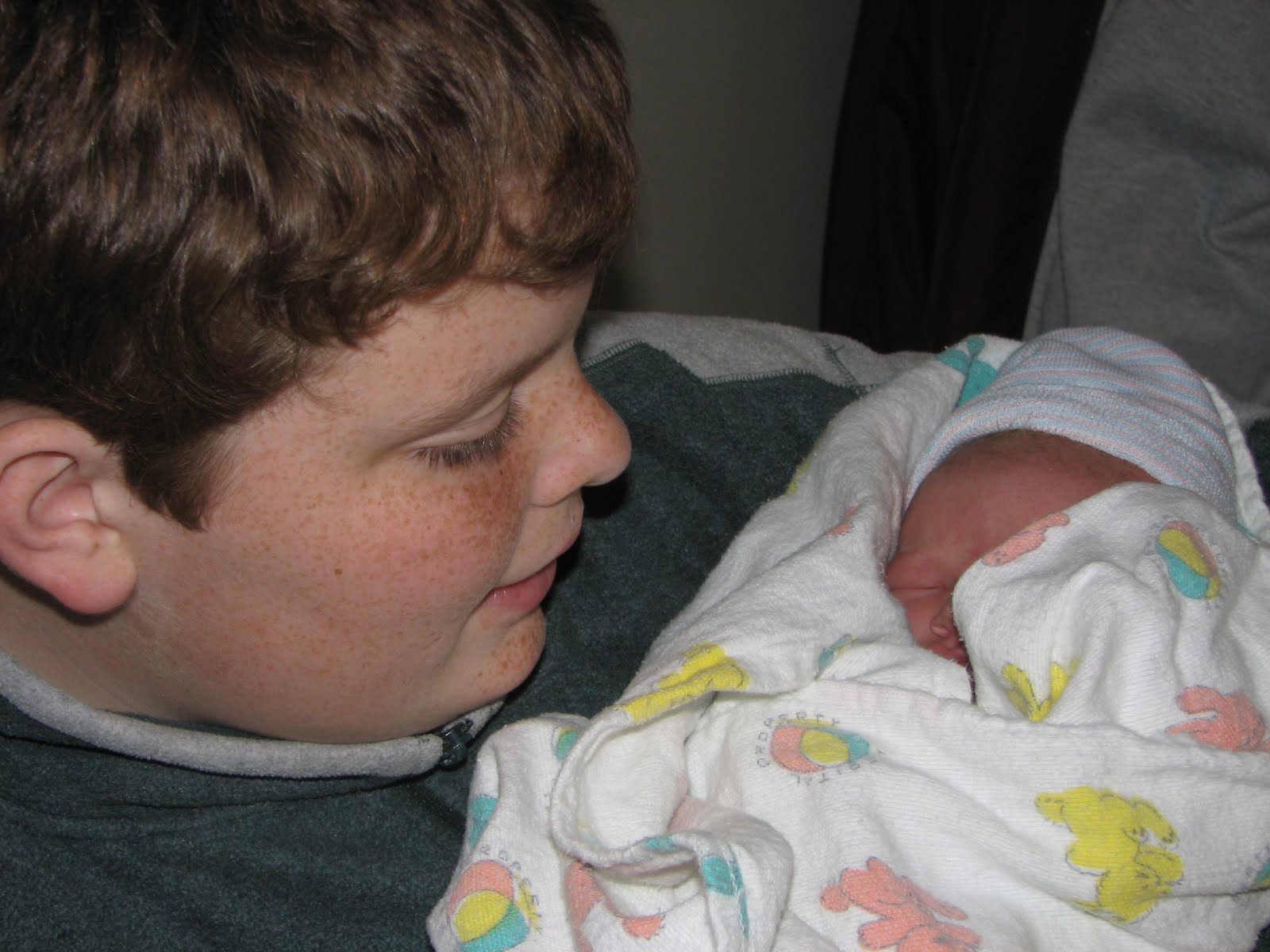 Now in the picture above, he is shown holding his much younger sister, but I think it's appropriate to show him with her, because of all the things noted of Big T--his good humor, his persistence, his unflagging willingness to do EVERYTHING the way it should be done, in spite of the Communication Handicap (spawned, we're fairly convinced, by those first purple minutes outside of the womb, and all the minutes before inside of it)-- the thing that most all of us marvel at, is his gentleness.