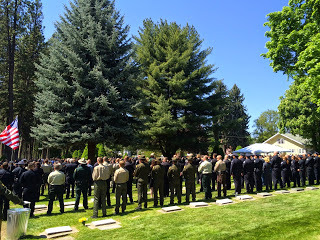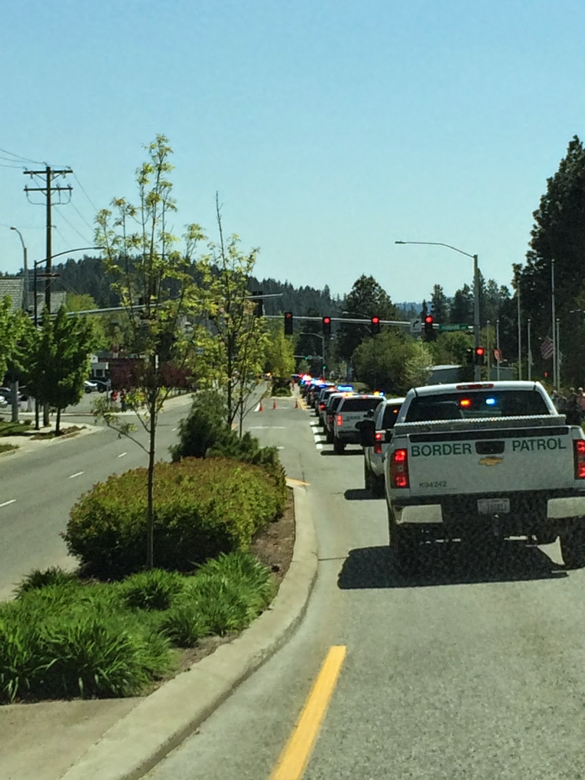 His service was unique in some regards, with sacramental methodology I had never before seen. One such instance occurred when seven members of the honor guard performed a bell ceremony, where a single bell was struck 21 times. Each officer participating in the ceremony individually saluted as the bell was struck, and each took a knee once in response to the bell’s toll. I understand the bell ceremony is part of a standard fireman’s salute to a fallen brethren, and the effect was rather profound. Once the ceremony was complete, we assembled in our vehicles to create the procession. In a noble and dignified response, hundreds of police and emergency vehicles followed the Moore family to the cemetery for the interment ceremony. The vehicles stretched across Coeur d’Alene like a blue and red flashing ribbon of honor, weaving through the streets and across town. The display of affection for their fallen comrade was not insignificant.