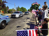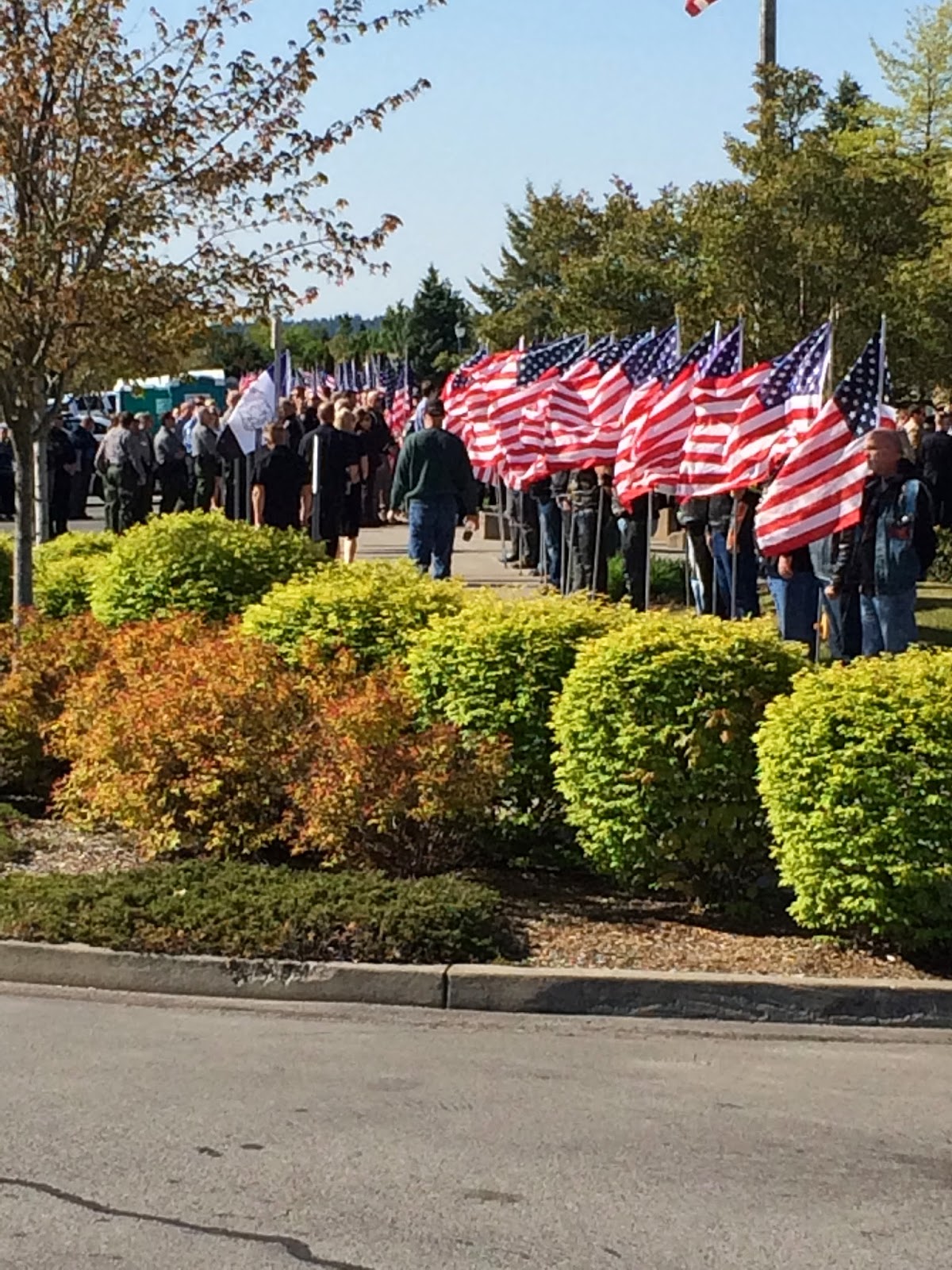 Even more poignant was the citizen response to the funeral. For the entire four-mile journey from the high school to the cemetery, families and individuals lined the streets to display their grief and respect, and demonstrate their unity with the Coeur d’Alene Police Department. The entire length was lined with flags, homemade banners, saluting citizens, and people kneeling on the edge of the road.
