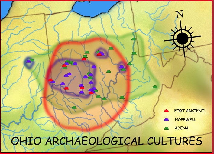 Below is a map showing the locations of the Adena and Hopewell Cultures in relation to the Fort Ancient Culture. We will talk more about the Fort Ancient culture in another series, as they are relevant not only to Ohio Pre-Columbian history but to Shawnee culture as well.