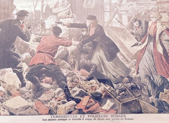 . Вот эта красота 1909 года, изображающая бой революционеров с полицией на подмосковной datcha, обошлась мне в целых 4 евро.Теперь висит на стенке.