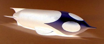 Rei and Rome turned to look where MINIMCOM was pointing. A large white ship was descending from the sky but it did not look like any spaceship either of them had ever seen before. It looked like an elongated bullet, all white, with stubby wings at the rear and a sharp, needle-like antenna sticking out the front. To Rei, it looked like something out of a bad science fiction movie. It circled around twice before landing right next to MINIMCOM, the starship. There was a whoosh and a popping sound and an all-white livetar appeared.Here is a picture of Commando Cody's spaceship, in negative, used to represent the clone ships produced by Planet OMCOM in the middle of The Milk Run: