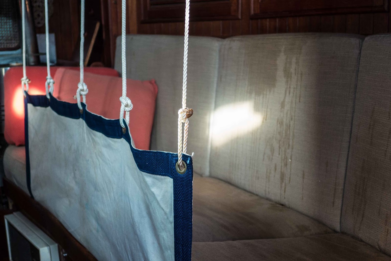Note the waterstains on our sea berth“I need you on deck, Bud,” I heard through the fog of a sound sleep. I was wide awake as I scrambled out of my sea berth. My feet hit the cabin sole and I staggered to the companionway ladder as the boat crashed from wave to wave. She was rolling through about 45 degrees to each side of vertical every few seconds and plowing into steep head seas with a jarring crash in between rolls.