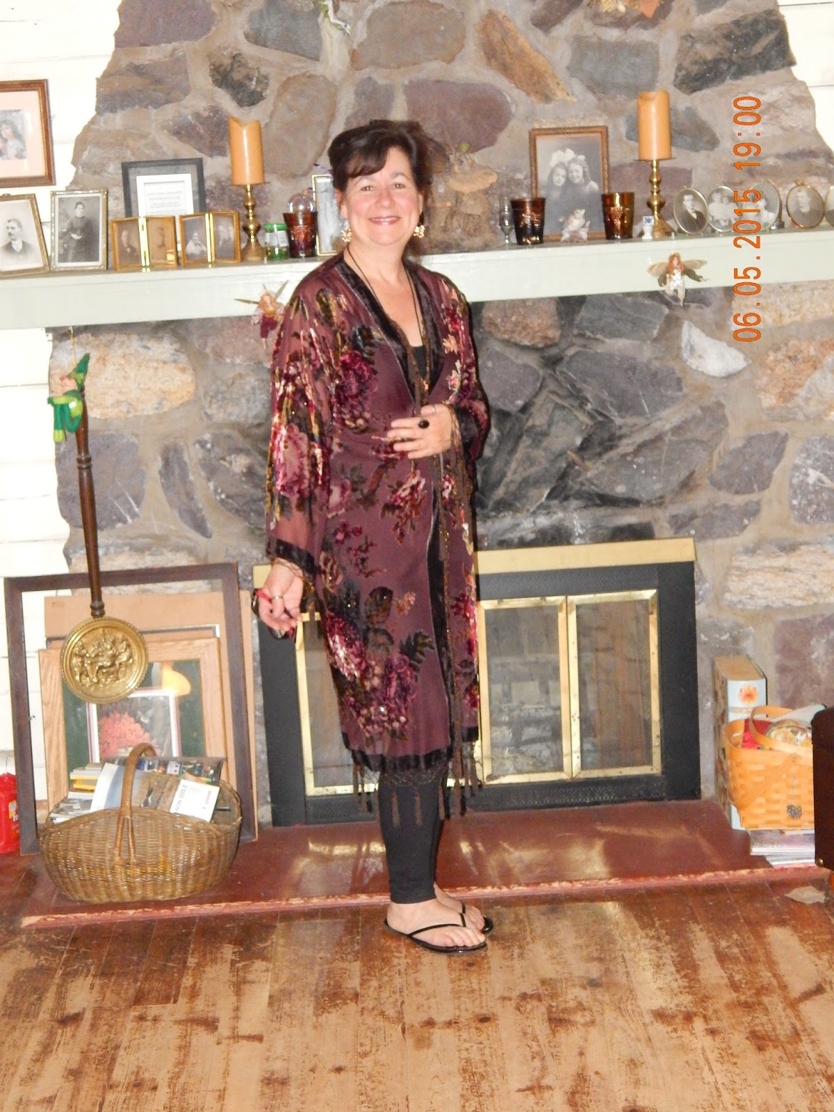 I asked my DH to take a pic of me two days ago wearing the same FAB velvet burnout kimono. See the difference 33.6 pounds and 33.5 inches makes?