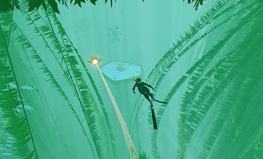 This type of mystery comprises the darker side of ABZÛ. Being set in the ocean and involving the exploration of it, it cannot and does not ignore the terror inherent in such a voluminous unknown. And so, there are vast spaces with no apparent surface to find, only fading water in every direction. There are also drones that can be repaired and sent to research mineral pools. But they are also fodder to the sharks that share the same waters. Go far enough down and totemic statues emerge. How did they get there? Who carved them? This is the start of the story beyond ABZÛ's beauty and it's what should keep us swimming downwards to, perhaps, where we shouldn't.