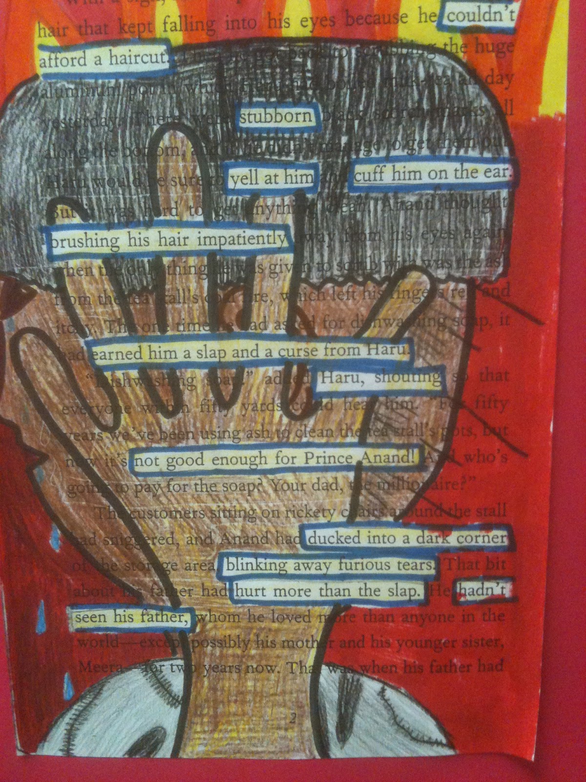 Students skim The Conch Bearer for passages that display obvious tones. Students identify the tone (implicit detail), and then identify words (explicit details) on the page that could be used to create the tone. They circle these words and then use art to edit out all the other words on the page with a picture that matches the new tone and/or narrative. Their work as an artist is to create an atmosphere in images that matches the words on the page; thesis statement as picture.