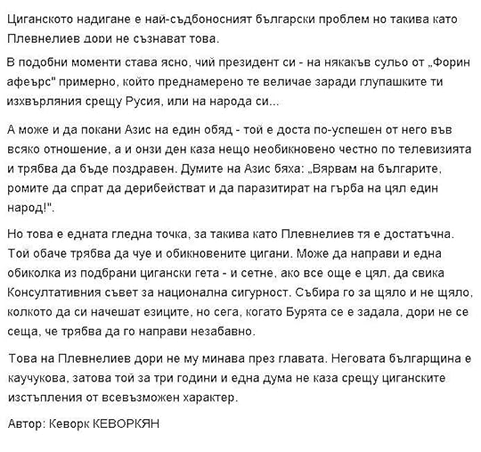 КРАТЪК МОЙ КОМЕНТАР: Виждате какви ги плямпа един платен от Русия подпалвач на етническа война между цигани и българи. Някои явно са взели хубави пари от своите руски кагебистки господари - за разпалването на кървава етническа война между цигани и българи, я вижте какви старания проявяват за да си заслужат парите! Абе няма ли в тази страна прокурори: нима за такова нагло нарушаване на Конституцията, за разпалване на етническа ненавист и конфликти тия разгащени ченгета няма да ги подведат под строга отговорност?! Ето кой подпалва българската черга, а прокурорите треперят от страх, щото а наредят да бъде арестувано ченге от ДС, а мигновено ще си загубят службата! Сфащате ли сега, драги гласоподаватели, КОЙ разпалва етническа война в свидното ни отечество?! Не циганите, а ченгетата от ДС и техните началници от руското КГБ ще запалят пожара на етническата война в България - това нима не го разбирате още?!