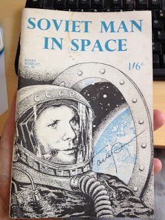 The Dr asked me to write something for the blog she runs exploring the archives of the Croydon Airport Society. She chose a booklet, "Soviet Man in Space" that she thought was my sort of thing. And it is - especially when its cover boasts the autograph of Yuri Gagarin, the first person in space.