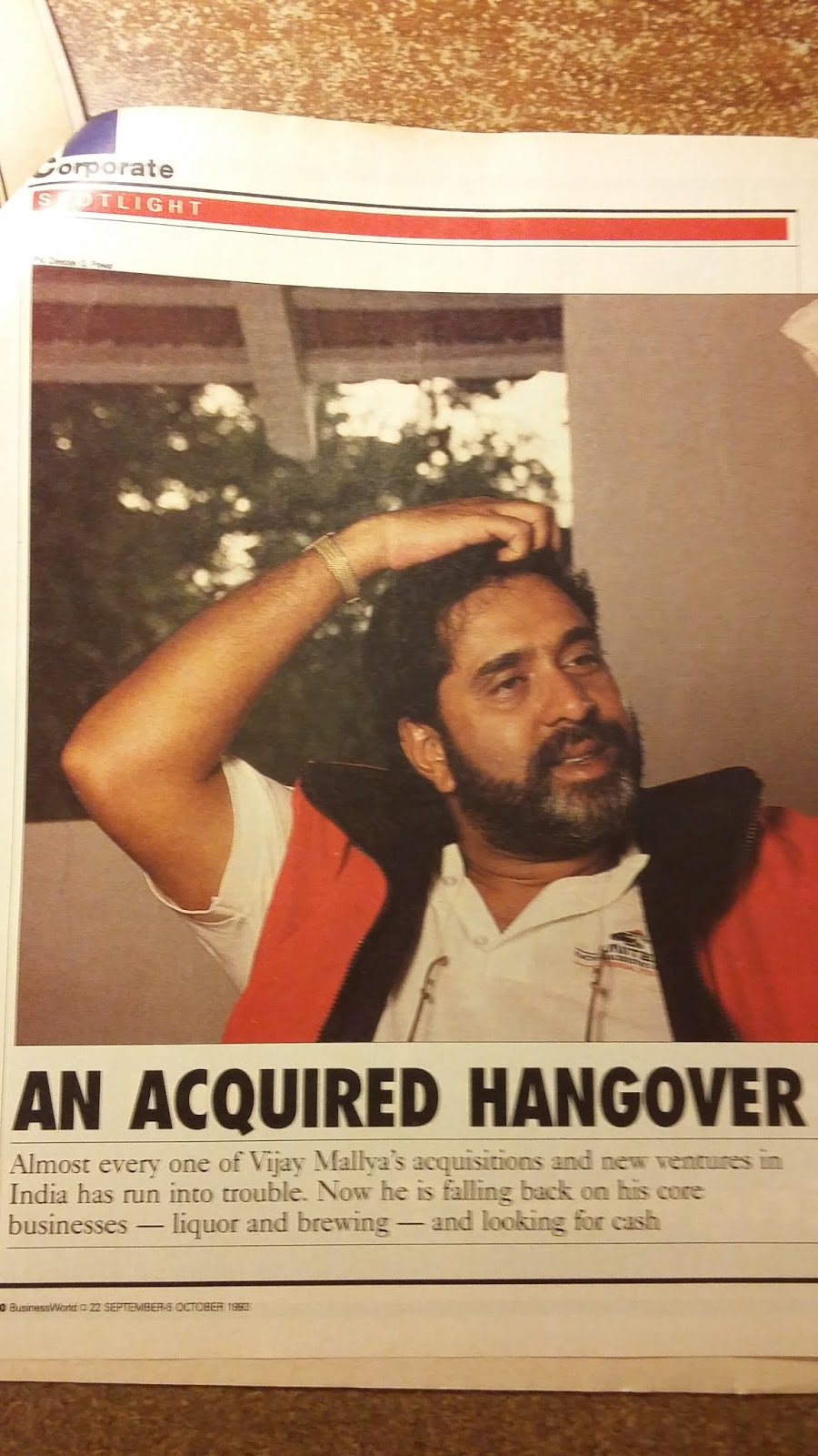 The lead page of my Businessworld story in 1993Way back in 1993, while working for Businessworld magazine as their Principal Correspondent in Bengaluru, I had written an elaborate story on how Vijay Mallya’s business empire was debt-ridden and that he was broke and cash-strapped. (Interestingly, even at this time, media reports suggest that Mallya’s business group’s present condition appears to be the same!) I remember waiting in Mallya’s UB Group headquarters (where the present day UB City is located) for 15 hours at a stretch because he was trying to avoid the interview. I even slept on the couch in his private lounge refusing to leave despite his EA’s insistence. This was to be the interview of my journalistic career and I was not going to give up! Finally, I managed to get Mallya’s time and his version of why his businesses were struggling. We ran the story, titling it ‘An Acquired Hangover’ and showing a completely sloshed Mallya at his Kunigal stud farm. Our photographer Deepak Pawar had counted the number of mugs of beer that Mallya had drunk in the three hours we spent interviewing him: 16! He had waited for the very end of the interview to get his shot to ‘fit’ the story’s central theme: that it was a series of reckless acquisitions that had landed Mallya in this mess.
