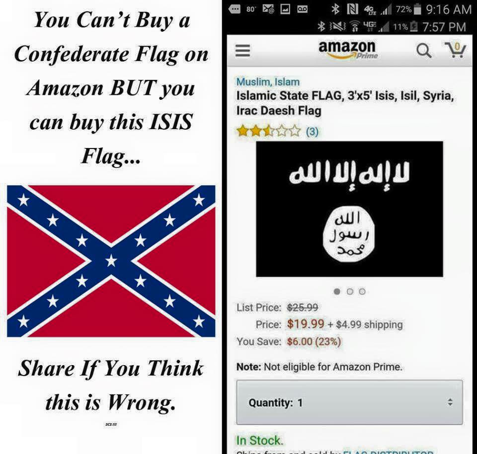 Said story, more often than not, turns out to be a total hoax, fabrication, half-truth or crazy rumor being reported as fact by our incredibly credulous news media.Last week was a fertile one for Twitrage, what with the continued fallout from the Charleston terrorist attack, the controversy over the Confederate battle flag, and the Supreme Court’s bombshell decision upholding the right of same-sex couples to marry.First, there was the picture making the rounds on Twitter and Facebook after Amazon.com, among other retailers, announced that it was pulling Confederate flag merchandise off its site.This latest expression of Neo-Confederate butthurt claimed, and I quote: “You can’t buy a Confederate flag on Amazon, but you can buy this ISIS flag,” followed by a supposed screenshot of an Amazon page offering to sell one of the terrorist group’s amateurishly designed black and white flags. And the thing wasn’t even eligible for Free Amazon Prime shipping. The nerve!
