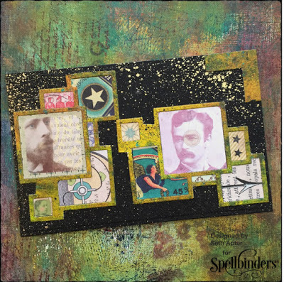 The images that I used to fill the frames were taken from 3 very cool pads of Spellbinders Ephemera Papers. I used the Contemporary Squares die to cut out my choice of images, keeping the negative pieces from the die cut to adhere inside the frames.