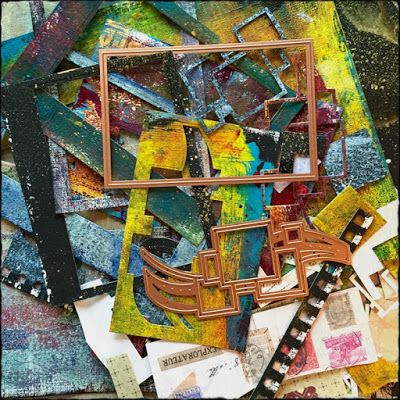 The base for this mixed media project was cut from hand painted watercolor paper using a die from Spellbinders Matting Basics B set. It measures 3 ⅝ x 5 ⅝ inches. I created the grouping of linear frames by using Spellbinders Contemporary Squares die to make two die cuts from hand painted paper in a contrasting color. After snipping off part of the die cuts, I arranged the frames as I wanted them and adhered them to the base. I often cut apart shapes that I have made from commercial dies as a way to individualize and put my own artistic spin on them.