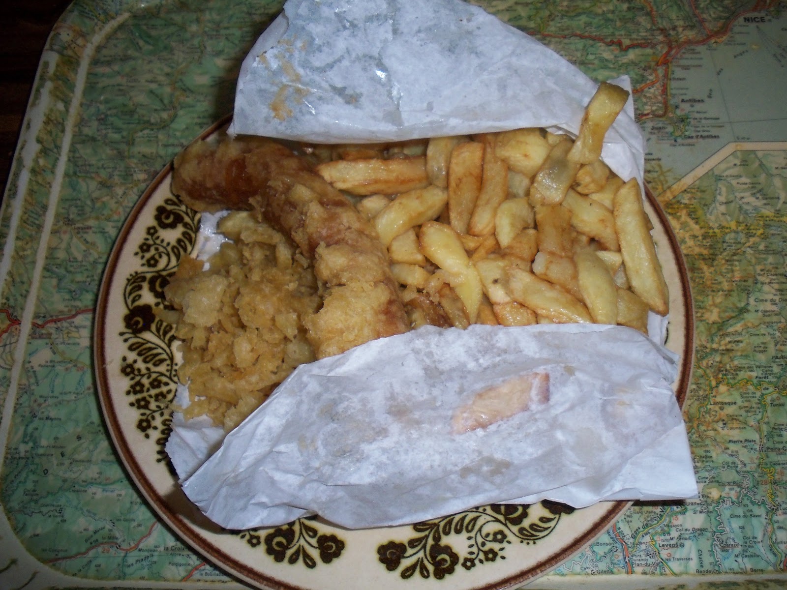 Something else we usually have is fish and chips or, in my case, deep fried sausage and chips with scraps. The latter is the bits of fried batter that fall off in the fryer and are collected to sprinkle on top of an order upon request. Our lady gave me a huge portion of chips and loads of scraps - we were talking about the lack of fish and chip places in America.There is nothing remotely good for you with this take away, but the fish and chips is something the cutie misses and since I don't eat fish, I get a friend sausage. Now, I admit it, the scraps bit is probably the worst bit, however, they are so very good, we remind ourselves it's a vacation and no one eats properly on vacation! On top of all this and can't be seen is salt and vinegar. Yummy! I guess I should also explain that if you happen to order fish and chips in a restaurant [there are loads of places that you order take away on one side and sit down to eat properly on the other] you might, particularly if you're the cutie, order mushy peas. I personally like my peas firm, but these are so beloved you can buy them by the tin in America [Batchelors is the best brand according to an expert I know :-)] at Amazon or your supermarket.