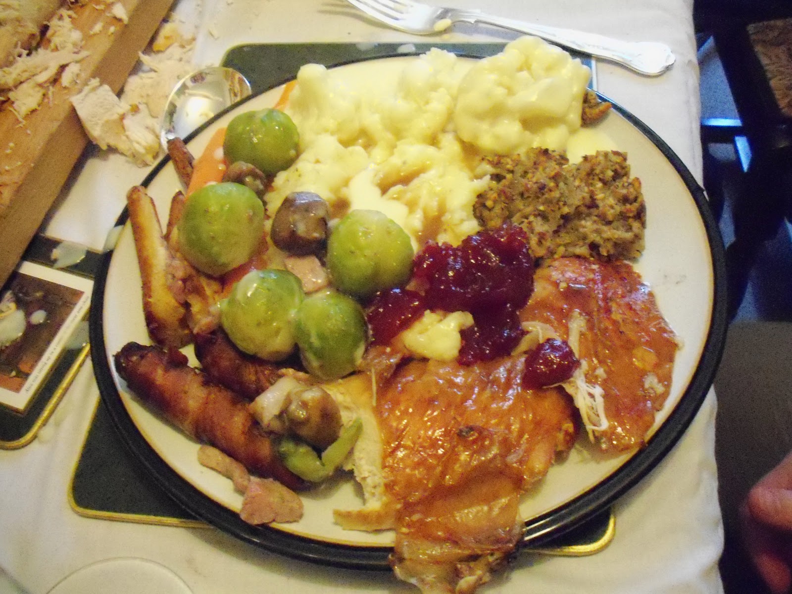Since it was Christmas, I'll tell you all about what was on our plates, actually the cutie's plate because mine didn't have everything on it. So, let's start at the 12 o'clock position [and go clockwise] with mashed potatoes, stuffing, turkey with cranberry sauce, sausage wrapped in bacon, sprouts with bacon and walnuts [there were also sprouts with nothing on them], and finally roasted parsnips. I know the cutie had carrots, although they can't be seen in the pic. Of course we did the cracker thing [pulled with resulting cracks, hats put on, jokes shared and toys played with, and then we dug in]. We were crowded at the table which always makes it fun to pass the gravy while not spilling it into the wine.Of course there was much more than this, but I don't want to bore you, so I'll leave you here to go plan a meal where scraps can join the party :-)