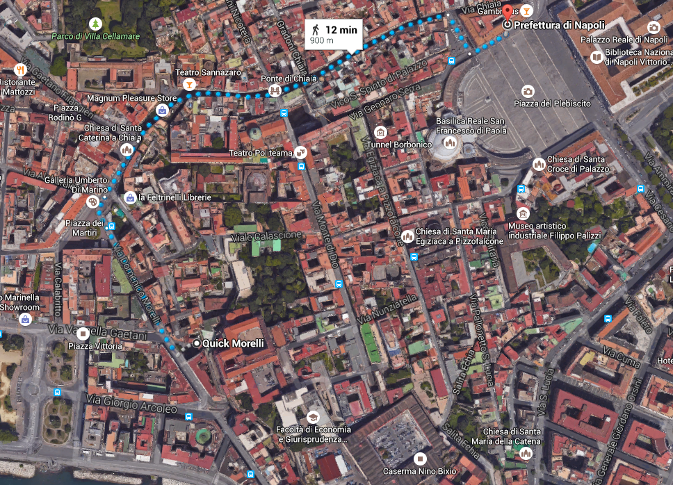 The passageway was planned to extend into Piazza Vittoria, which housed a military barracks. But it was never quite finished.Today, the main entrance to Il Tunnel Borbonico can be accessed in Piazza Plebiscito, the large, central piazza of Naples in which the Royal Palace resides. A giant parking structure sits on top at the other end of the tunnel, but one can access the tunnel from within the parking lot.
