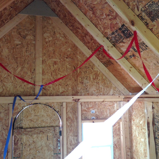 We broomed and shop-vac-ed the ceiling and corners and floor (yuck yuck YUCK!) Then the fun began. We raided the garage for carpet pieces, unpainted furniture from my remaining stash (I KNEW there was a reason I'd been holding onto them), and Lilah took apart the broken kite and hung the streamers from the ceiling with tape.