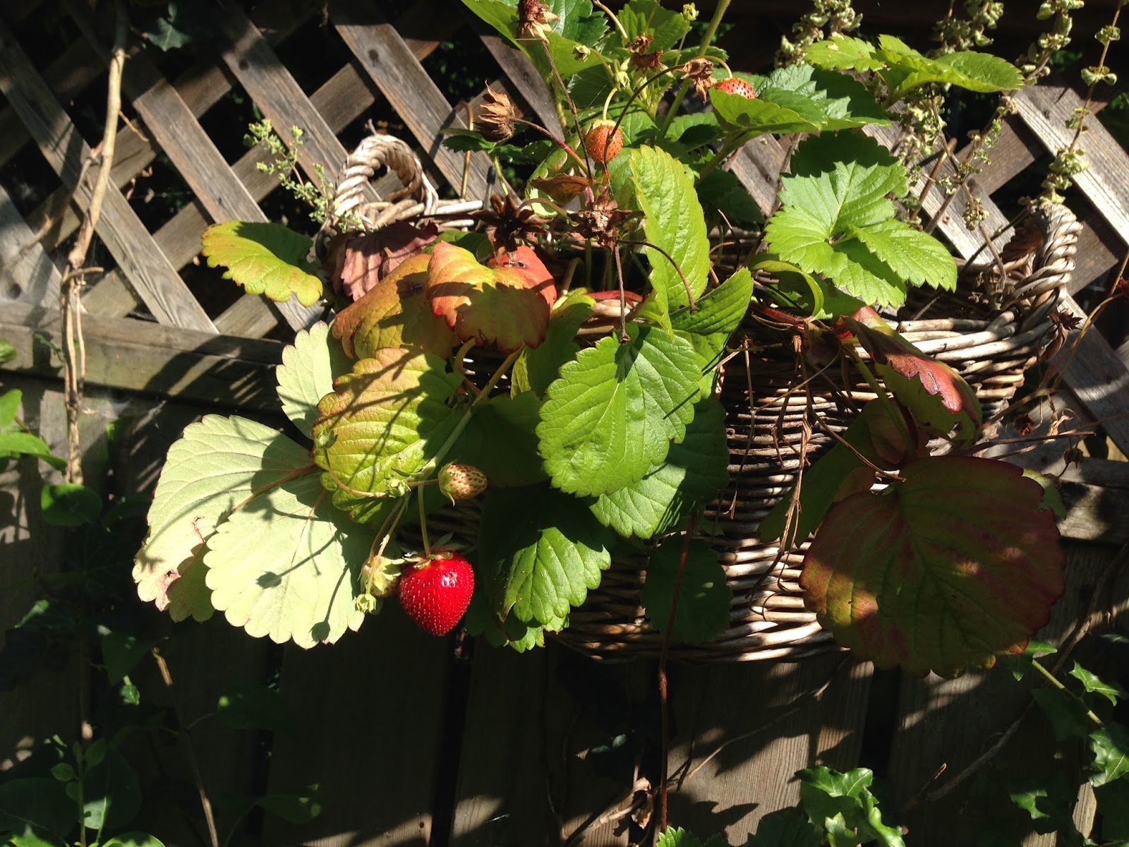 I went to the market this morning and came back loaded down, am spending the day gardening and cooking - have to cook huge salads for tomorrow. But right now, I sit here looking at the garden, never more lush than today - it's a perfect day, hot but breezy, quiet because - as always on my birthday - it's a long weekend. There was a gift from the garden this morning - besides two new gardenia blooms, there was one perfect strawberry.