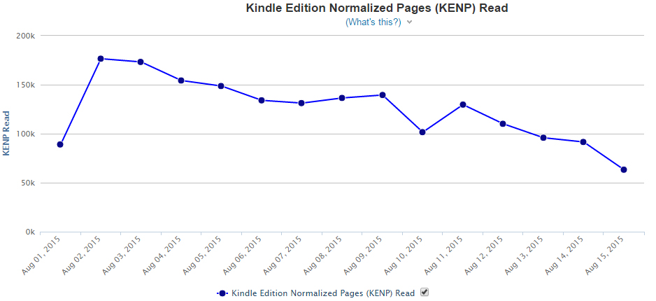 Since it's only the 15th, the graph only shows two weeks worth of reads, but already we've racked up 1,875,253 pages read across both books. Yes, that is 1.8 million, in two weeks. Now, of course, we d won't know what the August KU payment will be until September 15, but since these KU changes are all on the author side rather than the reader's (and given that KU payments historically don't tend to shift by more than 5% in either direction from month to month) I don't think it's too far a stretch to say August's payment will be very close to July's. So if we assume that and multiply our 1,875,253 pages read so far in August by July's $0.0058 payout, we made $10,876.46 in the last two weeks.