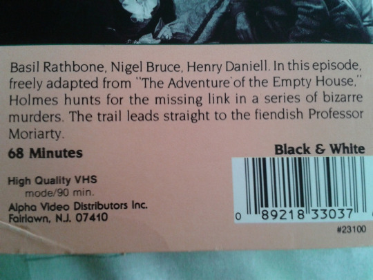 You may have noticed from some of my posts that I’ve been on a bit of Sherlock Holmes kick lately, and yesterday I went up to the attic and brought down a VHS of one of those old Rathbone movies that I haven’t seen in years. When I wiped all the dust off the case, look what I found in the description:
