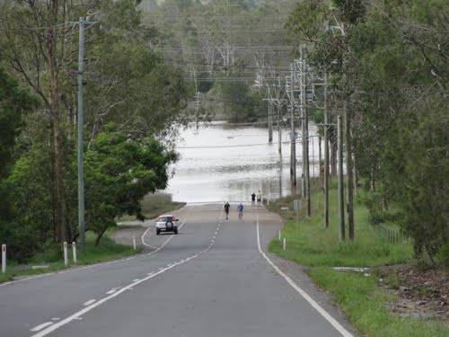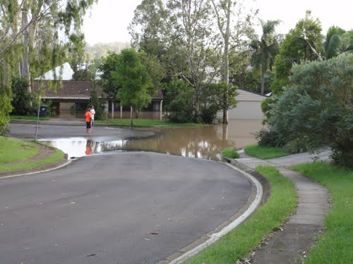 We're finally free after being cut off by flood water with no power, no food bar what we had in the cupboard that didn't need to be cooked, and no way out of our suburb for the past 4 days! This picture is of the main road out. Yesterday.Our street was cut off by flood water at both ends and we ended up a small island of about 20 houses, a mini-community of families all looking out for each other as the waters rose around us. Scary stuff. Our house was thankfully spared but our little hamlet of Bellbowrie was devastated, including the entire street below ours which was under water when we woke up Wednesday morning, and our only local shops which were roof deep in water and are already being razed to the ground. All this in the middle of suburbia.