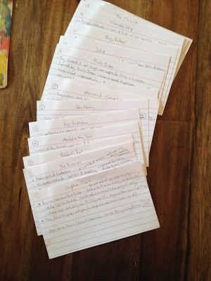 All of this allows a story to take shape in my imagination. Once my head was brimming with ideas and painfully impatient to begin, I began to outline the story using index cards.