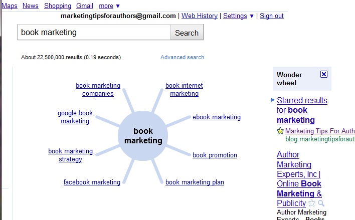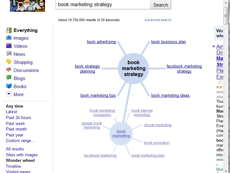 The neat thing about the Wonder Wheel is that you start to see more keyword ideas that Google find relevant to the term you entered. Now I have 8 more keywords to explore to seek out the ones relevant to my site, giving me ideas on what I want to use in my SEO efforts. And watch what happens when I click on the term to the left, Book Marketing Strategy.