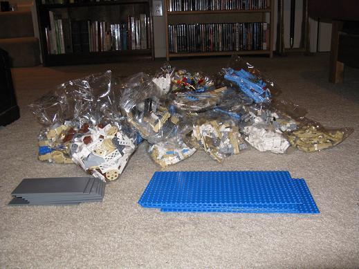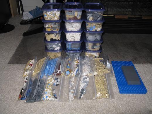 still had the bins and ziploc bags from when he built the Lego Taj Mahal at work, so the Day Zero step was to open all those sacks and sort the pieces into something resembling order: