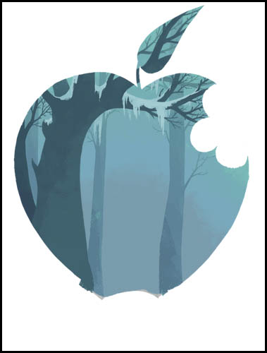 Now I lay on the figures! They were relatively simple to color, I only used one or two shades to lighten and darken the flat colors. My main objective was to get Snow White to stand out- Originally my idea was to have her be completely black and white, but it just didn't feel finished. So I added red, since I had the idea to add some to the background, and it really grounded the center of the image, and made her pop out without making her look completely removed from her environment.