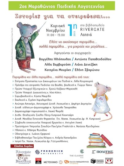 Την Κυριακή 1η Νοεμβρίου 2015 (μεταξύ 11:00 – 15:00) θα πραγματοποιηθεί στο βιβλιοπωλείο Rivergate στη Λευκωσία ο 2ος Μαραθώνιος Παιδικής Λογοτεχνίας.Κατά τη διάρκεια της εκδήλωσης θα αναγνωστούν βιβλία των συγγραφέων Βαγγέλη Ηλιόπουλου, Αντώνη Παπαθεοδούλου, Λήδας Βαρβαρούση, Λιάνας Δενεζάκη, Κατερίνας Μαυρίκη, και Ελένης Σβορώνου.