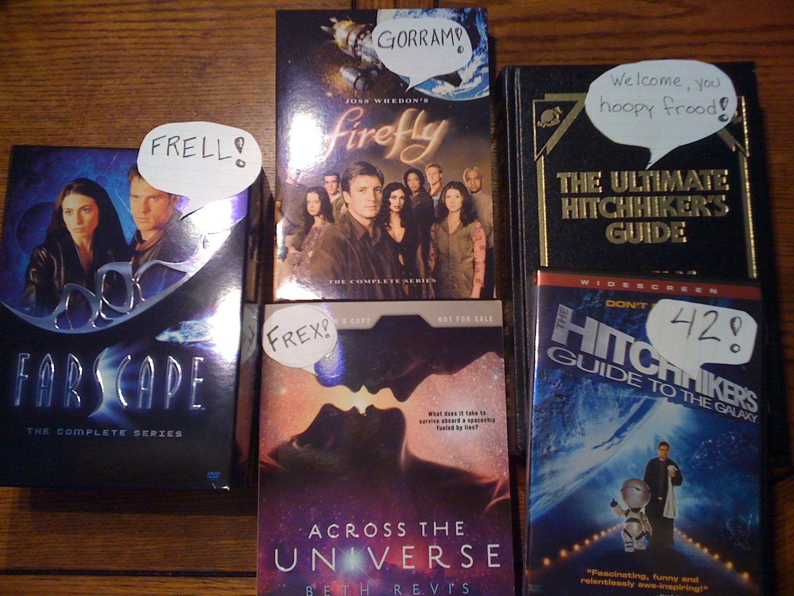 Eve's entry didn't technically qualify because it's an ARC (and she knew that--she just sent it in to share with me, not to enter), but I liked it so much I totally threw it in this post to be a runner-up. It's just...you guyssss.....she put my little book next to FIREFLY and HITCHHIKERS GUIDE!!!! And the books are all cussing in their own special way! Y'all know I like me some cussing! XD