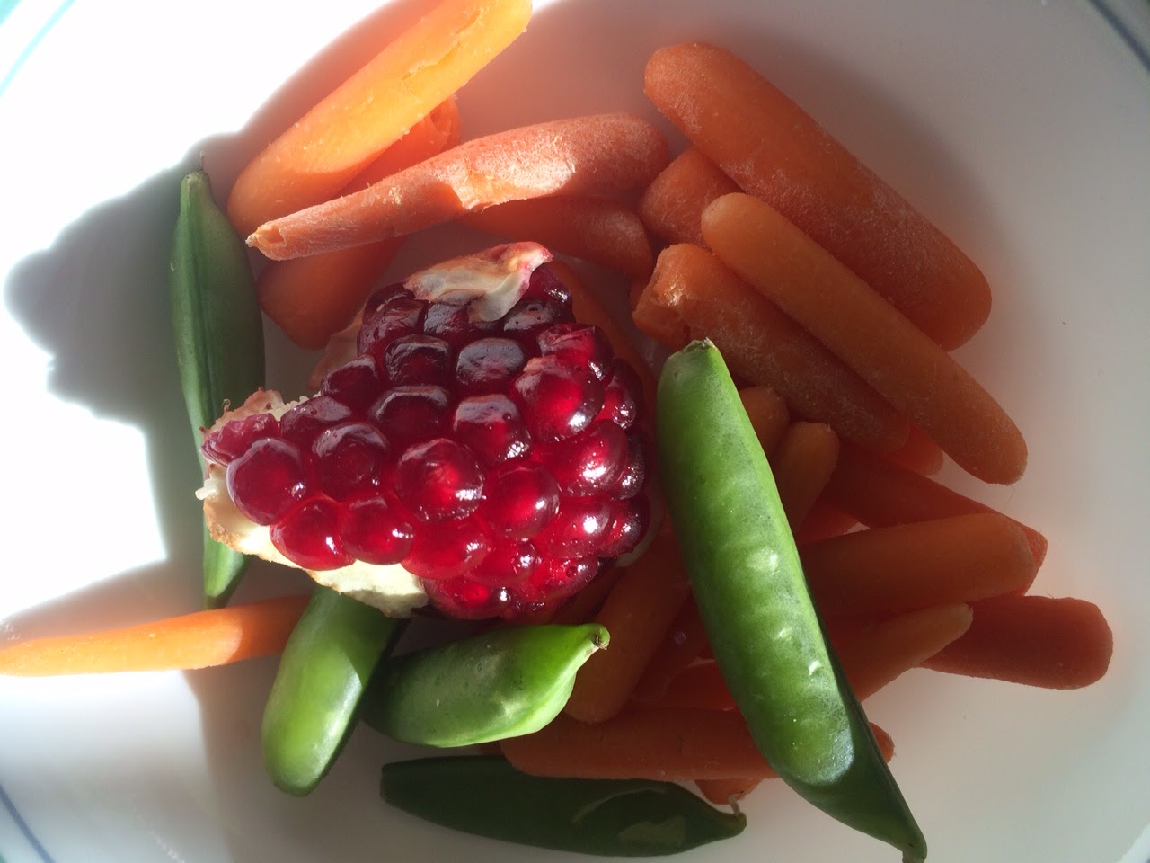 And speaking of food for thought! I'm trying to be healthy. Yes. Very heathy. You see, when I'm sitting here writing and writing and writing I like to also munch. And drink. And lick pens. So this morning for breakfast I had a bowl of crunchy veggies while working on my story. (And pomegranates. If you've never had pomegranates I'm sorry and I hope you rectify that soon.)