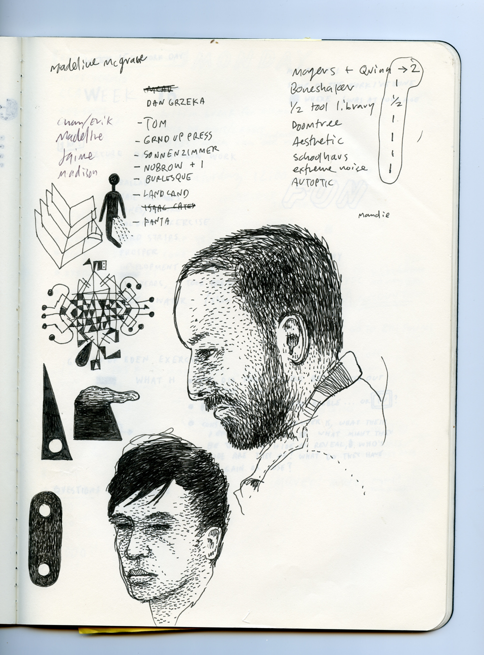 And these are a few drawings from Autoptic meetings earlier this year (and one of a colleague at MCAD, Kindra Murphy, from a meeting there last Spring): Zak Sally, Jenny King, Raighne Hogan (twice, in various stages of beard growth), Robert Algeo, Justin Skarhus and Jordan Shively. Somehow I never got around to drawing Caitlin or Tom. Next time.