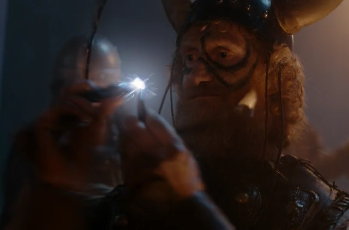 So the Doctor tries to dazzle the How To Train Your Dragon-ers with some magic technology (sonic sunglasses) and fails completely. (As he should!) Then he tries again (with a yoyo and a booming voice), and fails again because someone else pulls the same trick, only more convincingly. Big, actual Odin turns up in the sky, bellowing commands. This bit's a hoot. "He's not a god! He hasn't even got a yoyo!"