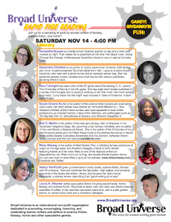 My author table, shared with Darin Kennedy, who was kind enough to give me the prime banner space.I got to talk about superheroes and characters from my favorite corners of the speculative universe with writers, fans, and artists. I offered my advice on panels, signed books at my table, and celebrated book releases with other writers. I met a man who built an R2D2 he could control with a remote. The members of Broad Universe were so kind and welcoming and I had a great time participating in my first Rapid Fire Reading with them.