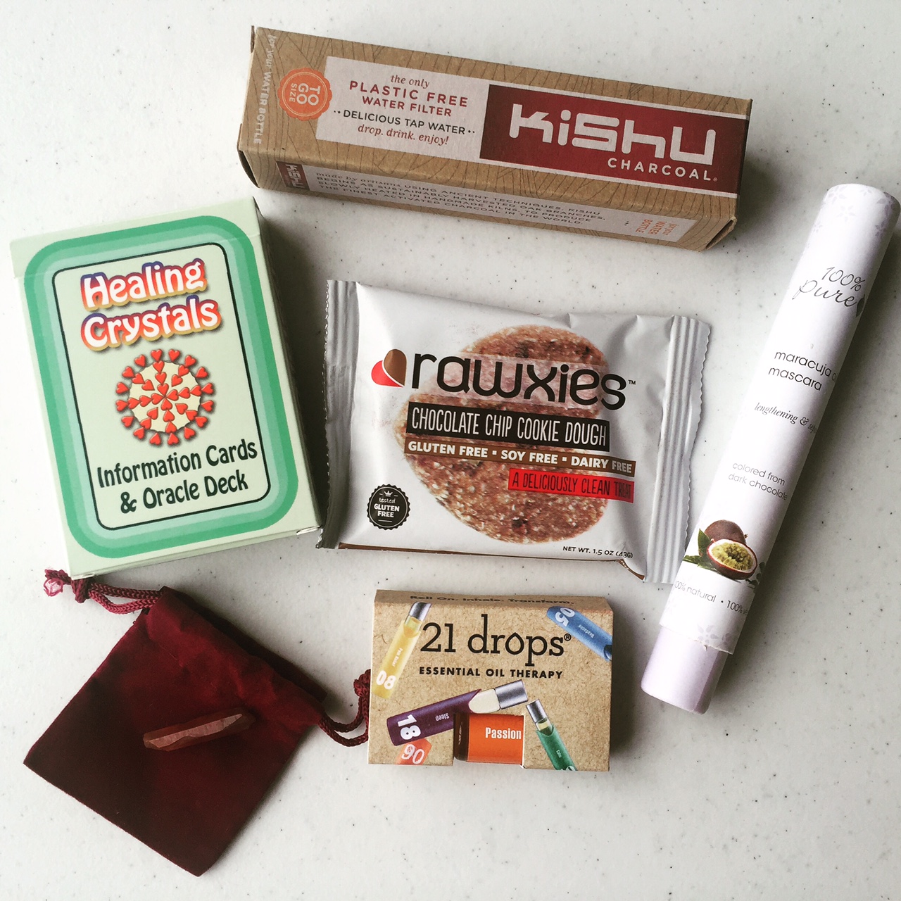 There's a Healing Crystals Oracle Deck, a Kishu Charcoal water filter, Rawxies Chocolate Chip Cookie Dough cookie, 100% Pure vegan mascara, 21 drops Passion oil, and a red quartz crystal. Also, Goddess Provisions subscribers get a free online sacral chakra balancing yoga class by Michelle Shea Walker.