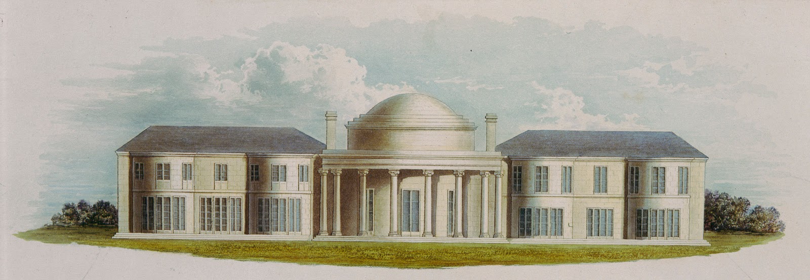 Prince George resided at Carlton House in London, a building he had turned into a palace filled with magnificent art works and sumptuous furnishings. Typical of his over-indulgence in all matters, as King, George IV had Carlton House demolished in 1825 for a new plan to enhance the new Regent Street. Meanwhile, he turned his Marine Pavilion in Brighton, from the tasteful building completed by Henry Holland in 1787, below, into a fantastical building in which the interior is Chinese style while the exterior is Indian-Mughal, whatever that is. Rev. Sydney Smith remarked upon seeing the Pavilion, "It looks like St. Paul's Cathedral came down and pupped."