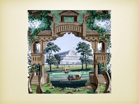 [3] The wallpaper designs above are from the collections of the Victoria and Albert Museum: the watercolor design by Owen Jones is from 1858: 'Wallpaper sample, called "Moresque", designed for John Trumble & Co.' The commemorative wallpaper for the Great Exhibition was probably produced by Heywood, Higginbottom & Smith. It was one of several chosen by Henry Cole in 1853 to illustrate "False Principles of Design" at the Museum of Ornamental Art, Marlborough House, London. Specifically, the design was said to illustrate False Principle Number 28: false perspective.