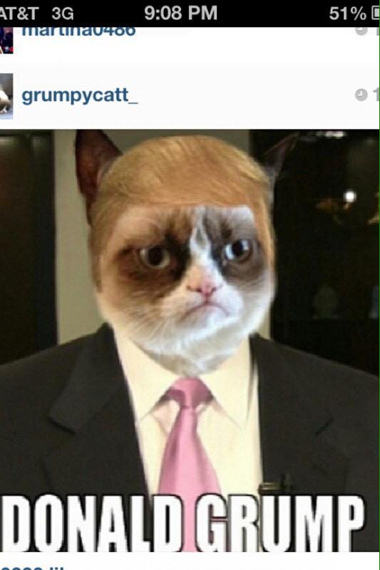 I don't really have anything prepared this time, so I'm just gonna (very) quickly talk about whatever is on the top of my head. And that is....Donald Trump for some reason. I take it you all have heard about what he said about not letting Islamic people into the country? *Sigh* Trump, Donald I gotta level with ya; this is 2015, publicly singling out and vilifying a certain group of people isn't gonna get you elected into public office. You already come off as an ignorant ass, and this is only making it worse. Hell, you know what? The Grumpy Cat is more electable than you....still can't convince me that that's not a wooden toupee, though. Although, I think we can all agree that ISIS must be destroyed. Soooo...yeah.