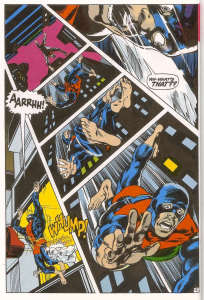 Wolverine’s body, however, does not entirely fit; his feet, part of his arm, and the top of his head are cropped. The column panel is symmetrical and abridged.